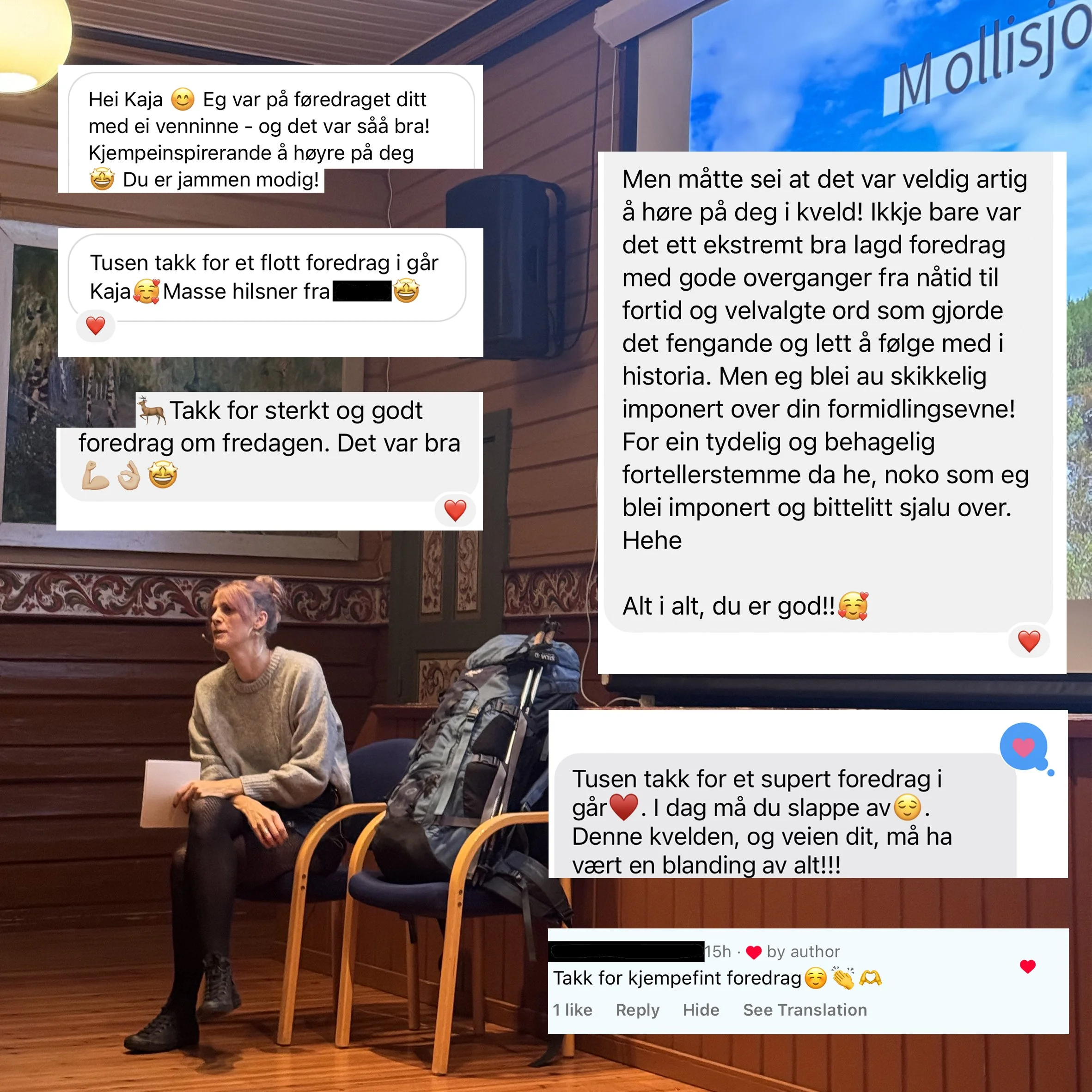«Jeg hadde gleden av å få med meg Kaja sitt foredrag «Kunsten å være sårbar» på Granvin den 10. november 2023. Det var imponerende og inspirerende å høre hennes beretning om en så heftig prestasjon, 4 måneder alene på tur over fjell og elver.